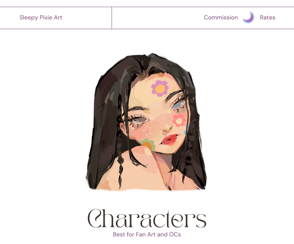 characters will be drawn and interpreted in my own art style/s. you may suggest a preferred style and I'll try incorporating it with mine. please don't ask me to mimic another artist's style.